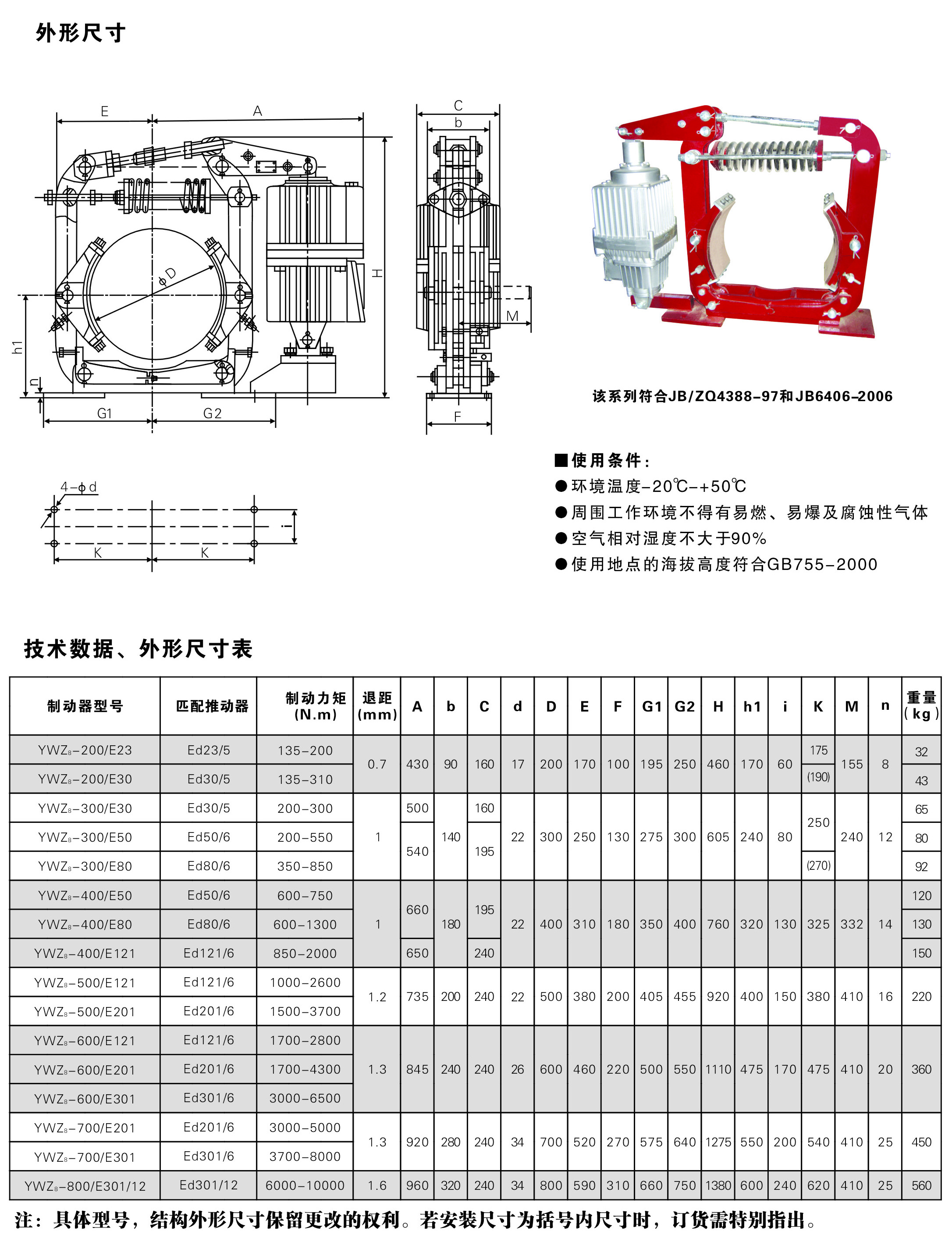 制動器安裝尺寸和制動力矩參數:JH/ZQ4388-97標準,技術要求符合JB/T6406-2006標準。