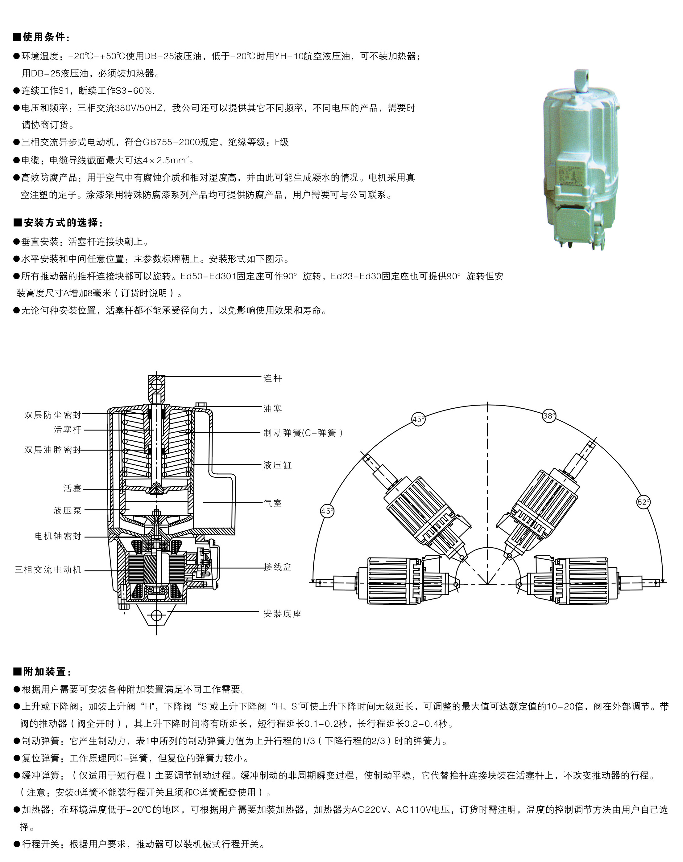油缸殼體在一側設有平衡氣室,可使推動器在0-180°任何方向安裝,從而擴大其使用范圍;
