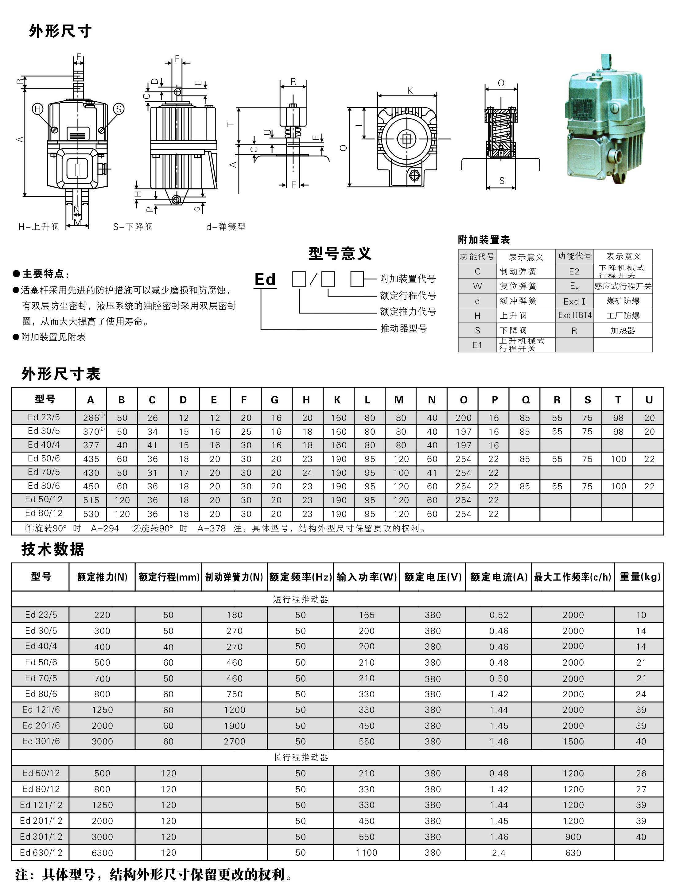 Ed系列推動器' >電力液壓推動器是一種集電機,離心泵,油缸為一體的,結構非常緊湊的驅動控制裝置,被廣泛用作各種塊式制動器和盤式制動器的驅動裝置,還可用于各種工業閥門,閘門,定向擺動和轉動(<90°)裝置(機構)及夾緊裝置的驅動控制。