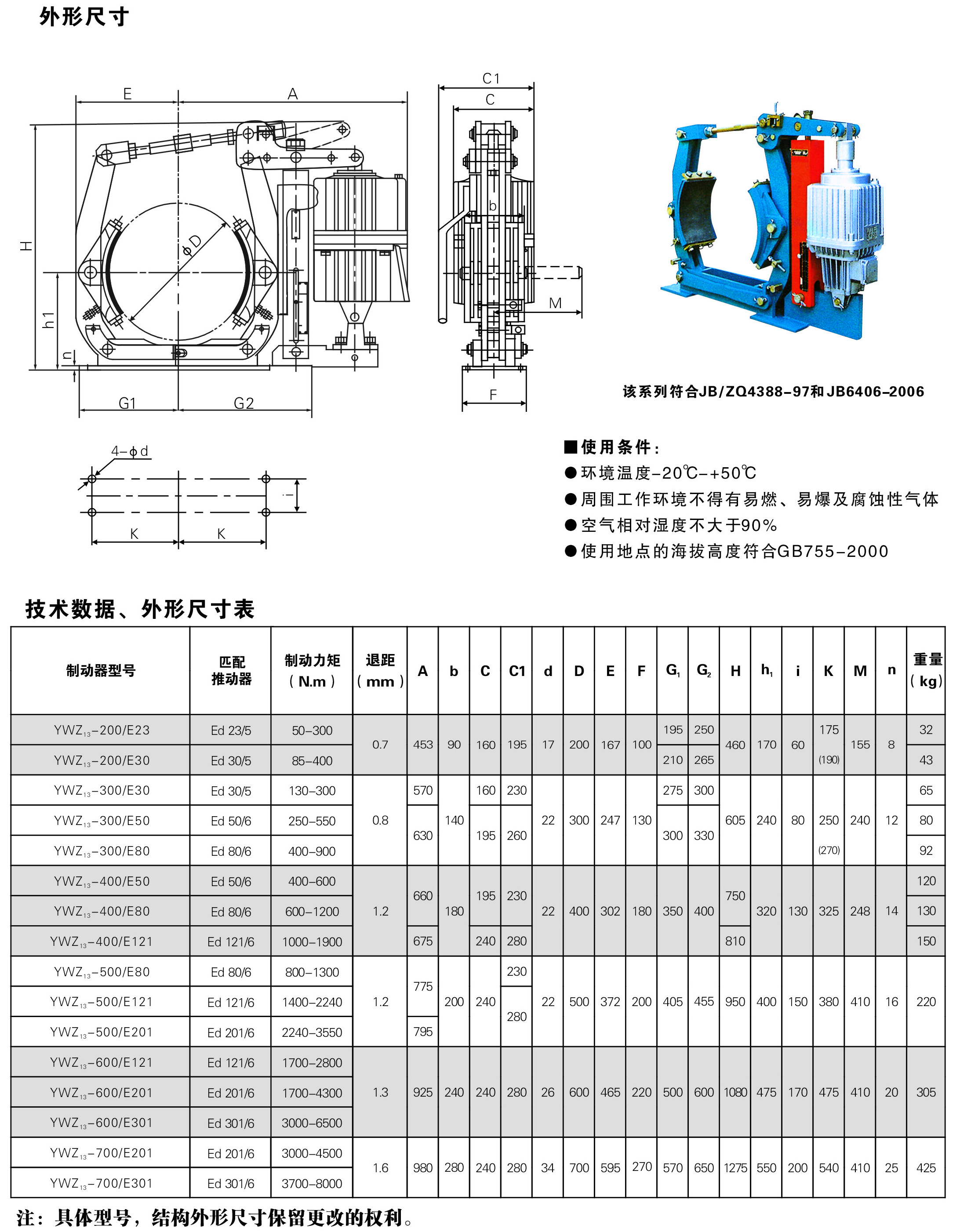 制動器安裝尺寸和制動力矩參數:JB/ZQ4388-97標準,技術要求符合JB/T6406-2006標準。