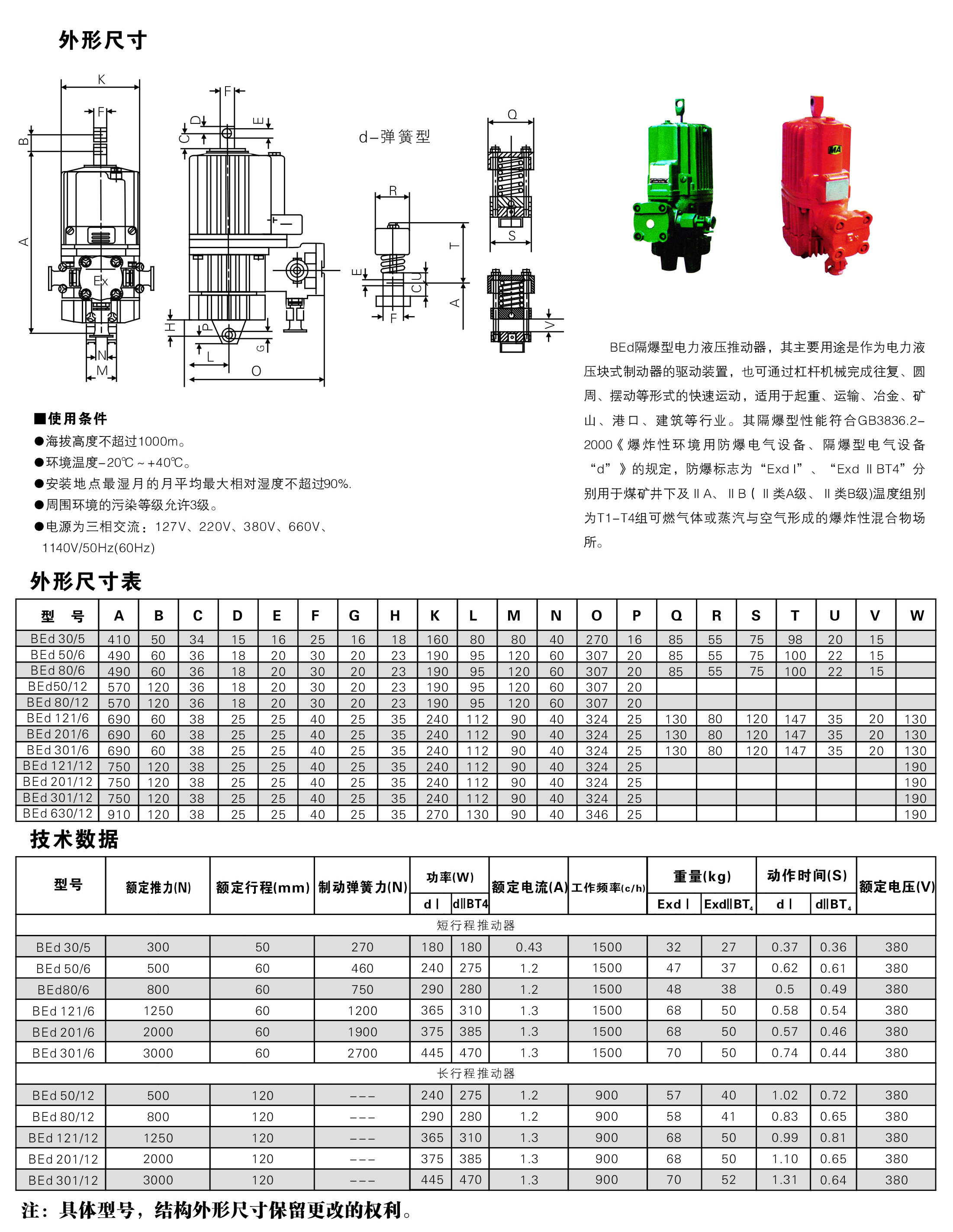 BEd系列隔爆型推動器' >電力液壓推動器是一種集電機,離心泵,油缸為一體的,結構非常緊湊的驅動控制裝置,被廣泛用作各種塊式制動器和盤式制動器的驅動裝置,還可用于各種工業閥門,閘門,定向擺動和轉動(<90°)裝置(機構)及夾緊裝置的驅動控制。